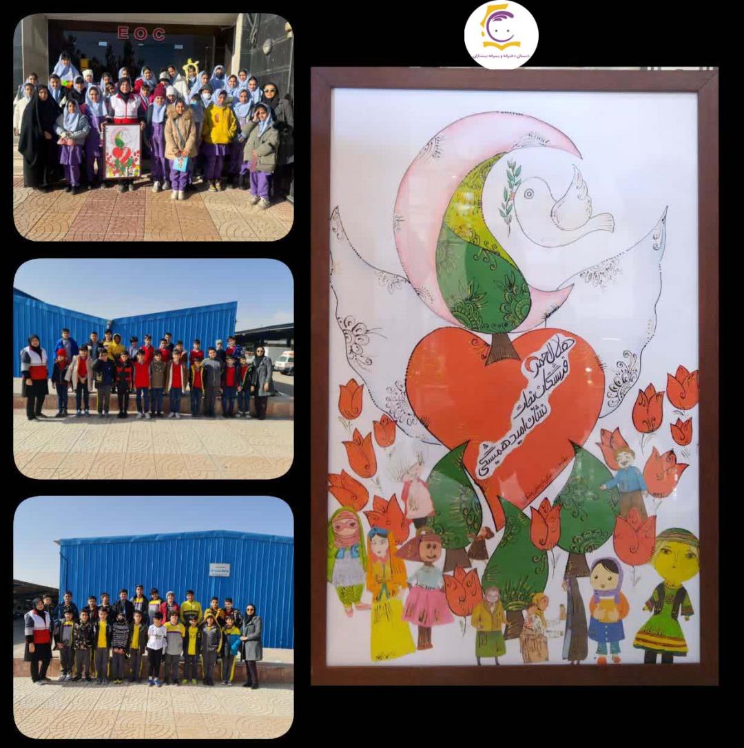 با توجه به بازدید علمی دانش آموزان پایه پنجم دبستان پیشتازان از جمعیت هلال احمر کرمان و مصادف بودن این بازدید با پرواز ملکوتی تعدادی از امدادگران و فداکاران کرمان ، دانش آموزان به پاس قدردانی از زحمات این فرشتگان زمینی، کار هنری خود را به این سازمان اهدا نمودند.